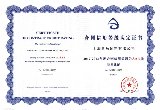 日前,我司榮獲2012-2013年度“上海市守合同重信用企業”榮譽稱號以及合同信用等級AAA證書,是上海市飼料行業少數幾家被授予AAA級信用的企業之一。這也是我司繼2008-2009年度以來,連續三次、6個年度獲此殊榮,成為連續兩次蟬聯此殊榮的佼佼者。