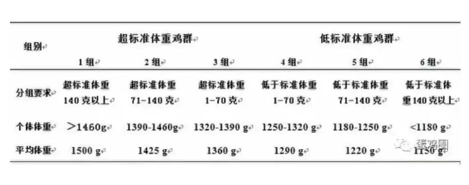 首先,以京粉1號父母代蛋種雞19周齡末的標準體重(1320克)為基礎,以70克為分組梯度,分為6組,每組3個重復,每個重復96只雞,各組雞只的體重均符合分組要求: